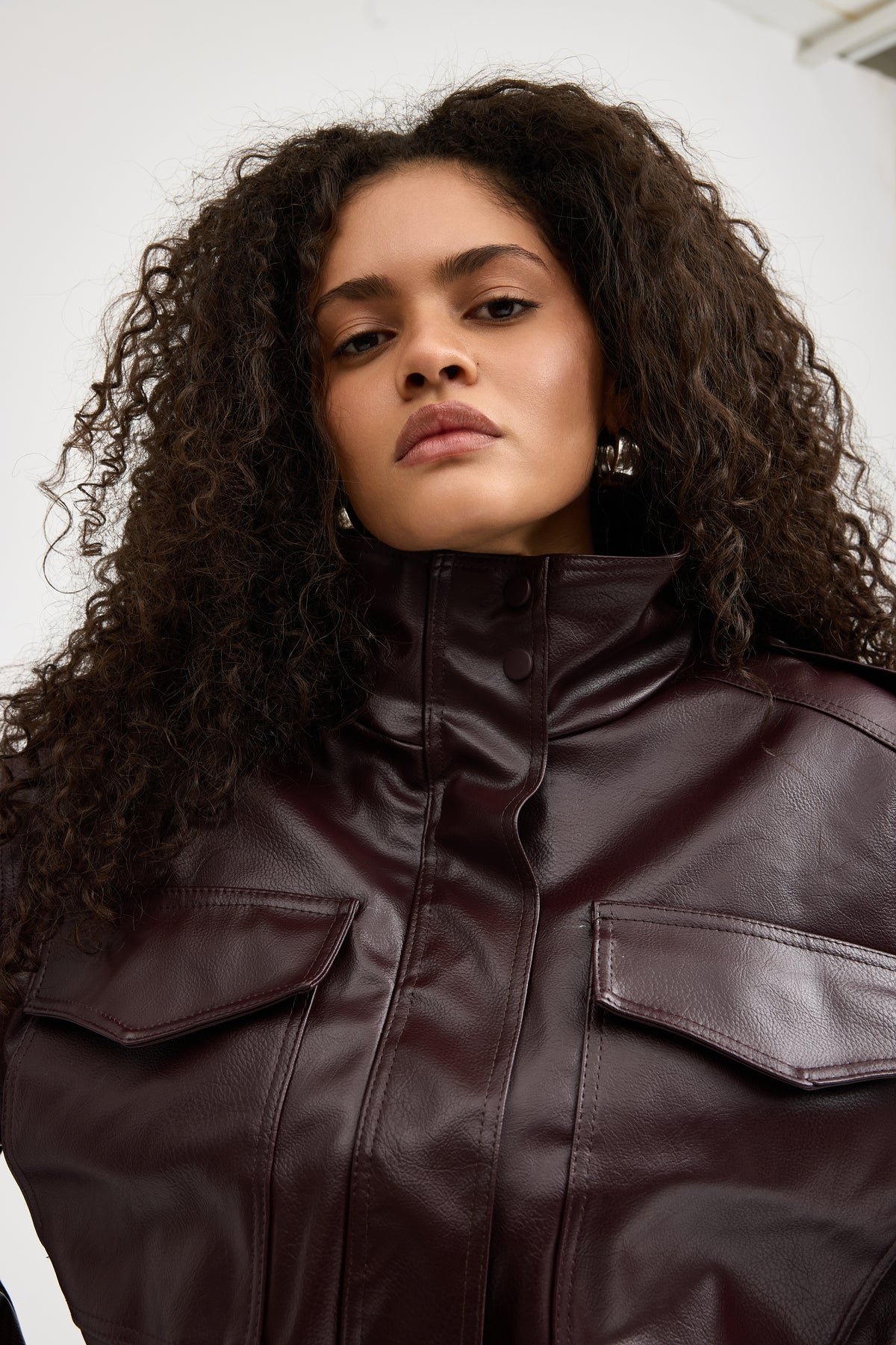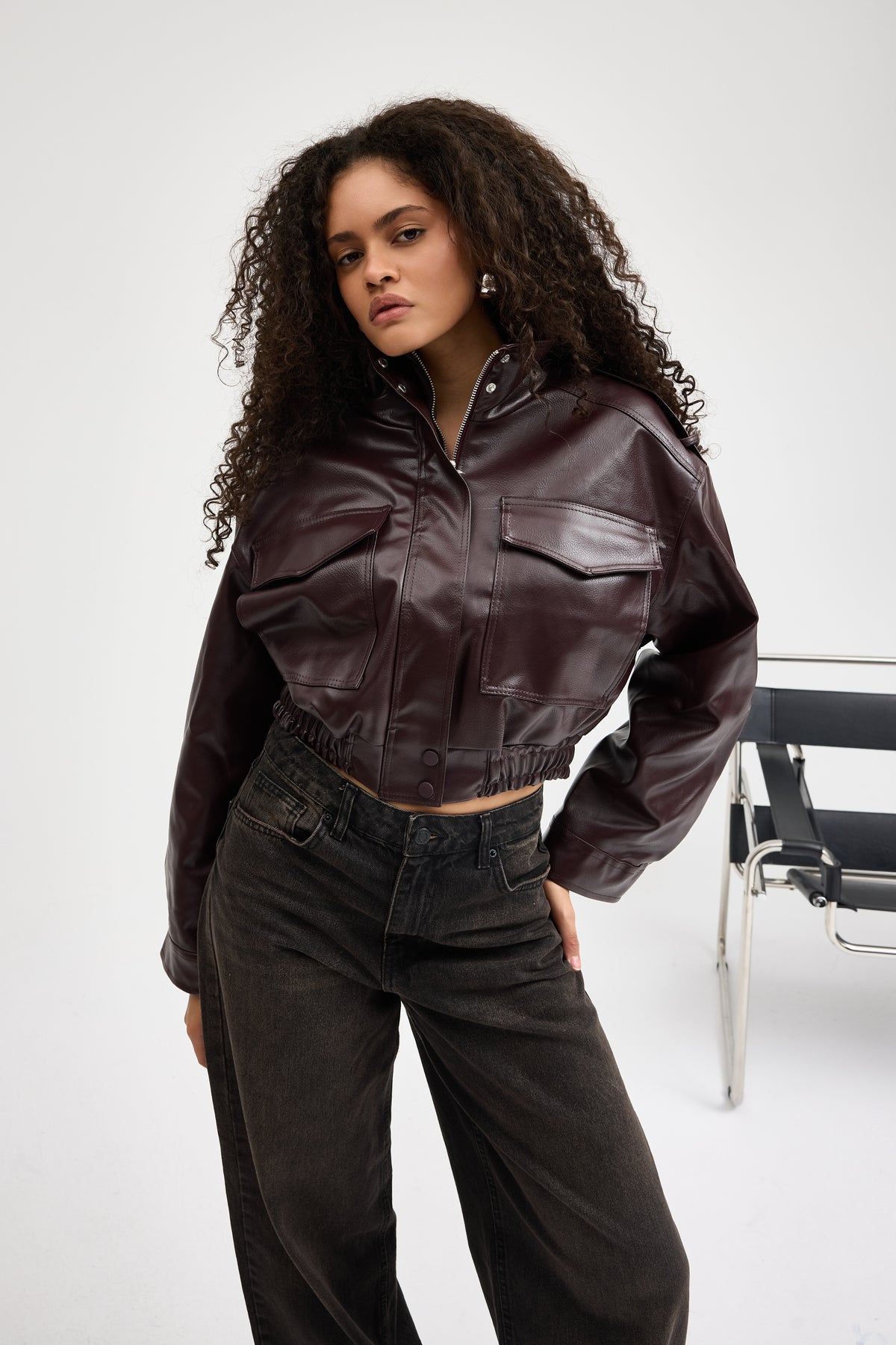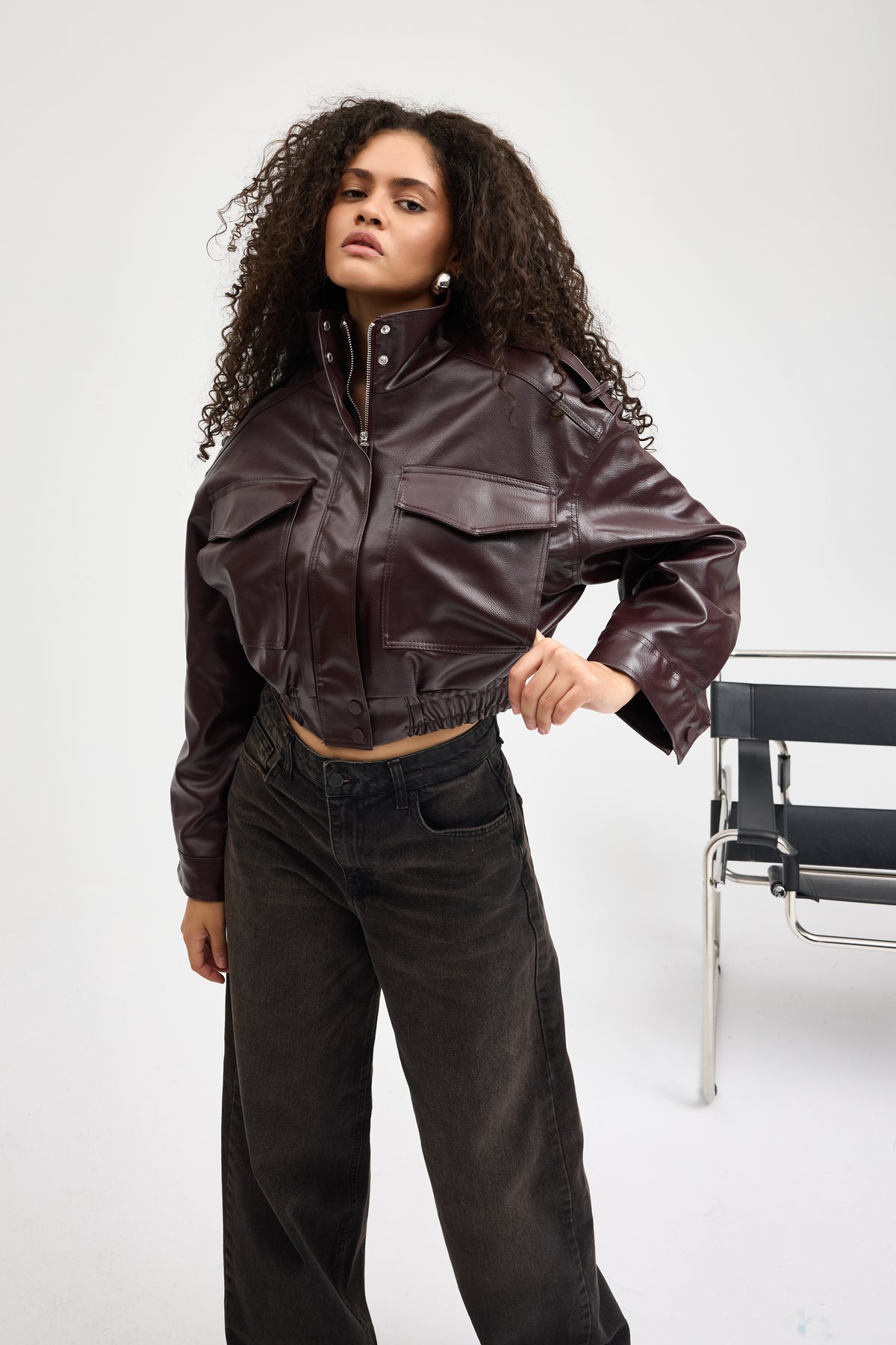 Routines Faux Leather Bomber Jacket - Burgundy 0609